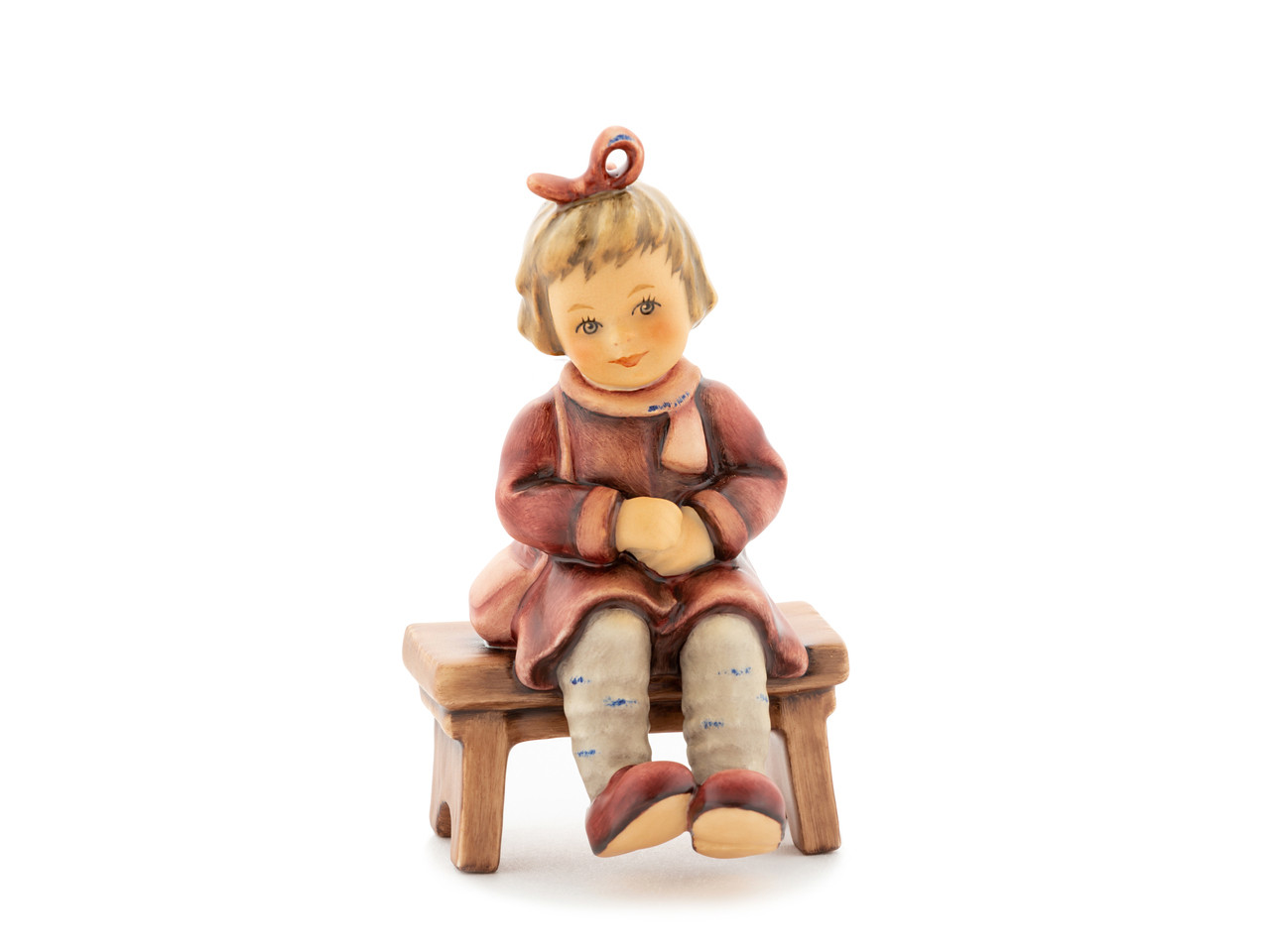 A Timeless Portrait of Patience and Grace. Who wouldn’t be immediately smitten by little Charlotte (HUM 2410)? This endearing Hummel girl, part of the New British Style collection, is a masterpiece of quiet charm. Dutifully perched upon a stool with a signature bow holding her hair in place, she sits with a look of patient expectation that warms the heart. Her soft, refined palette reflects the "New British Style," blending traditional Bavarian craftsmanship with a touch of classic elegance, making her an exquisite centerpiece for any mantel or curio cabinet.